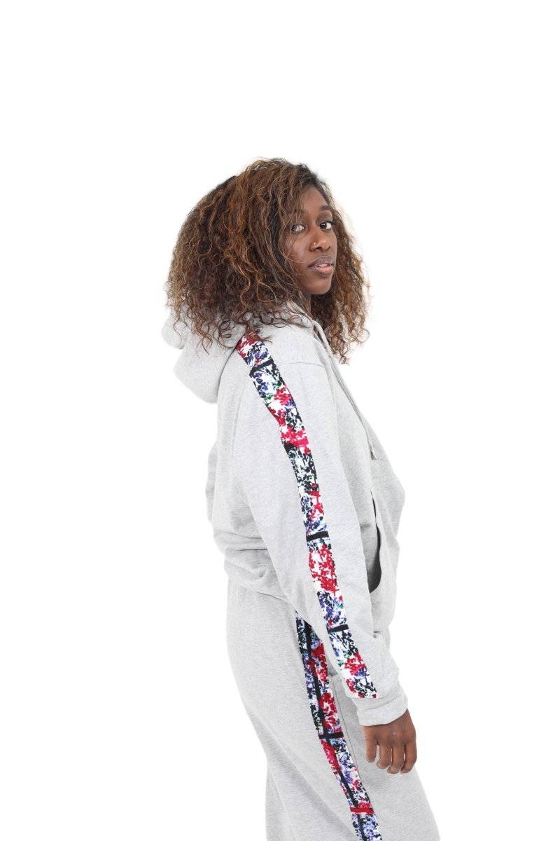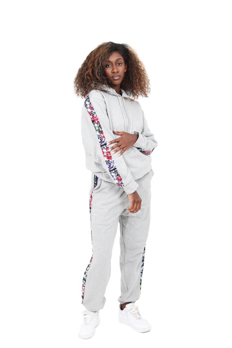 Upgrade your athleisure wardrobe with this stylish and unique grey hoodie and jogger set, handcrafted by Smooth Visage. This cozy two-piece tracksuit is lined with vibrant African tie-dye (Adire) fabric along the sleeves and pant sides, blending modern streetwear with a bold cultural twist. Perfect for casual outings, lounging, or making a fashion statement.