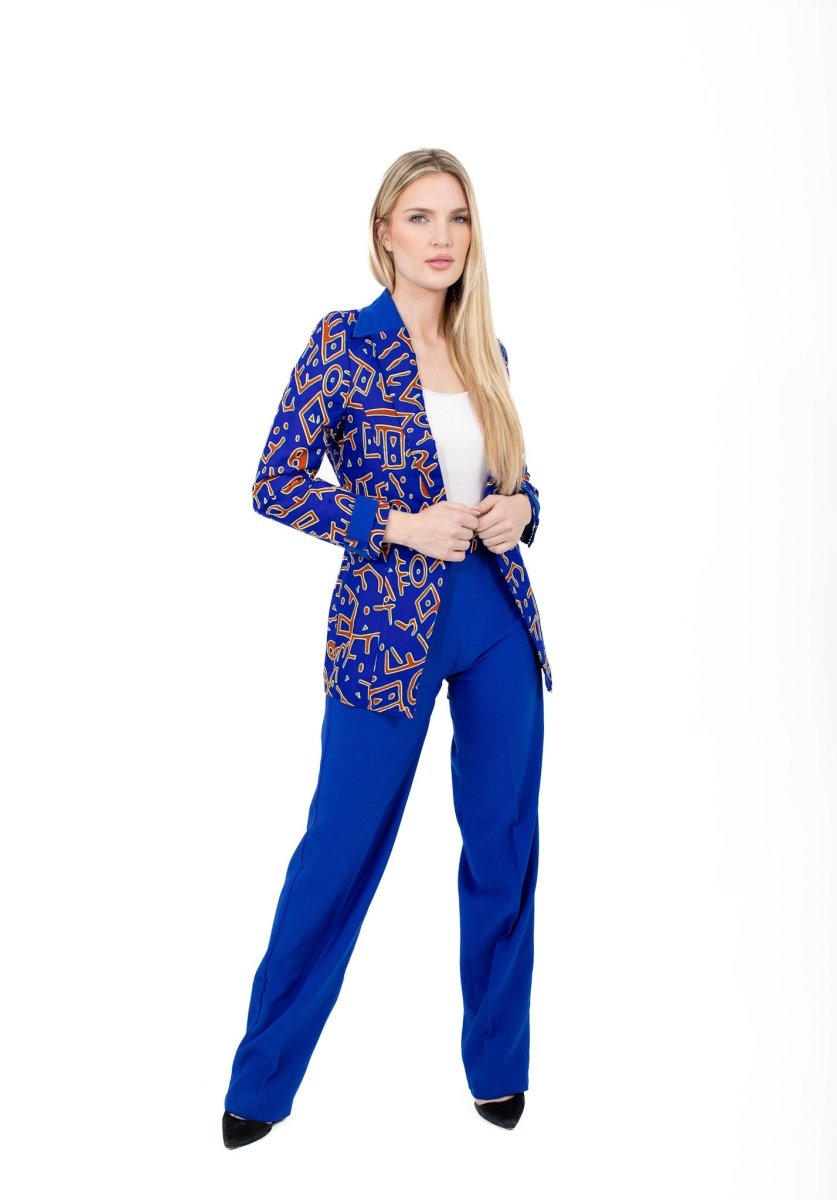 Make a stunning fashion statement with this Royal Blue Ankara Blazer & Crepe Pant Set, a perfect blend of African-inspired vibrancy and modern sophistication. The structured blazer features a bold Ankara designed with abstract patterns in orange and yellow hues, beautifully contrasting against the deep blue background. Paired with solid royal blue wide-leg crepe pants, this set is designed for women who love to stand out with confidence and style.