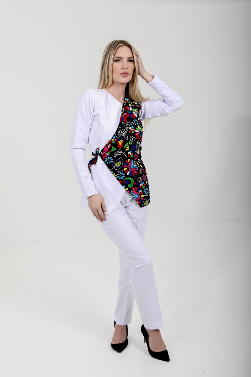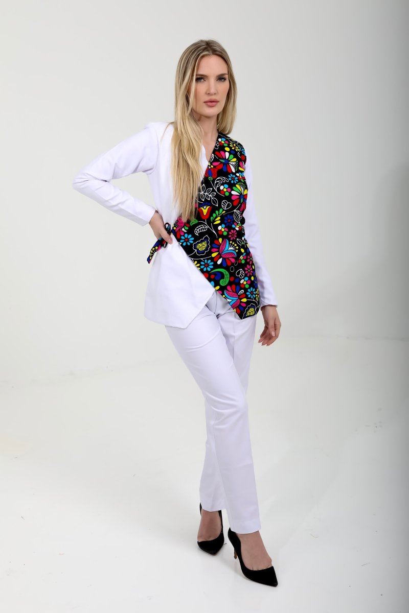This elegant two-piece suit blends modern sophistication with vibrant African print accents. The asymmetrical wrap-style blazer features a contrast Ankara panel that adds a bold and artistic touch. The suit includes fitted straight-leg pants, completing a sleek and polished look.