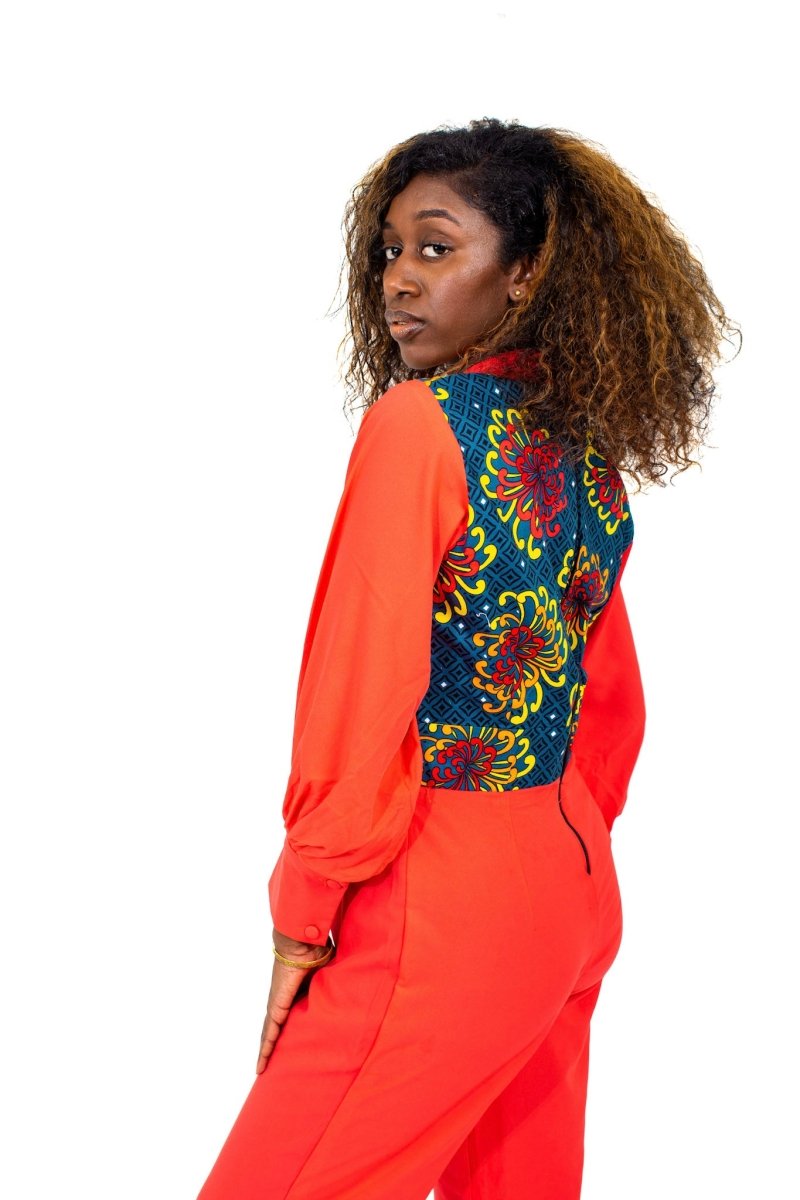Smooth Visage Coral Red Ankara and Crepe Mix African Print Jumpsuit