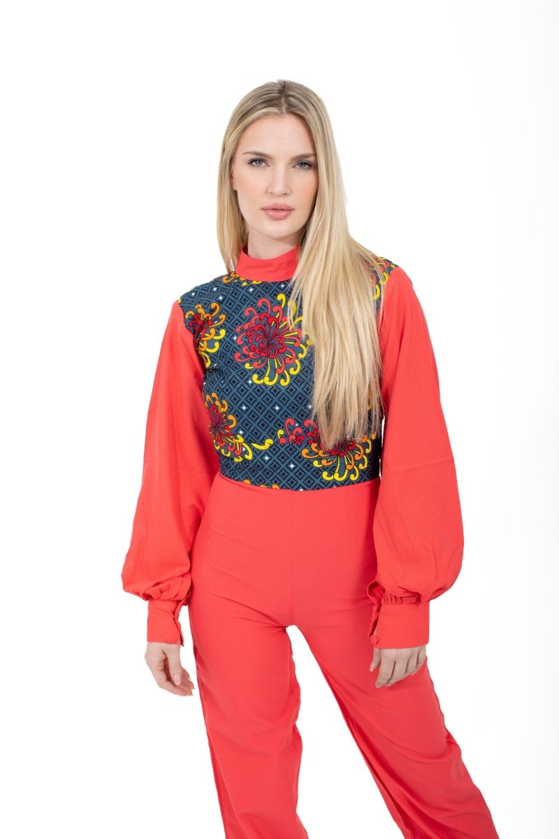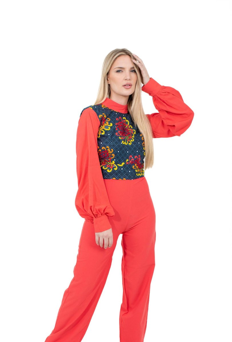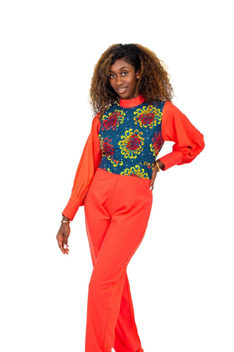 Command attention with this elegant two-tone jumpsuit, featuring a bold Ankara print bodice with intricate floral designs, contrasted with solid vibrant orange wide-leg pants and long bishop sleeves. The high neckline adds a touch of sophistication, making it perfect for both formal and casual occasions.
