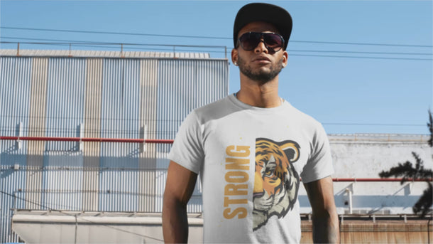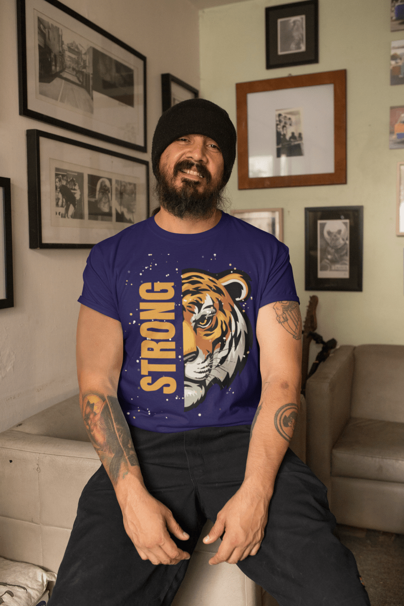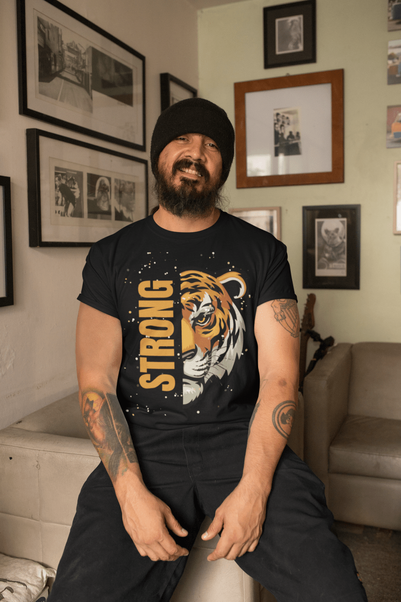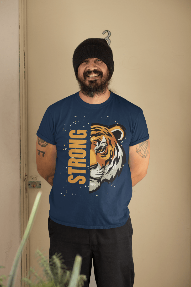 Unleash your inner strength with this bold tiger graphic T-shirt. Designed for men who embrace power and confidence, this classic round-neck tee features a striking half-tiger face print with the word "STRONG" for a fearless and motivational look. Made from premium, soft cotton, it's perfect for casual outings, workouts, or everyday wear.