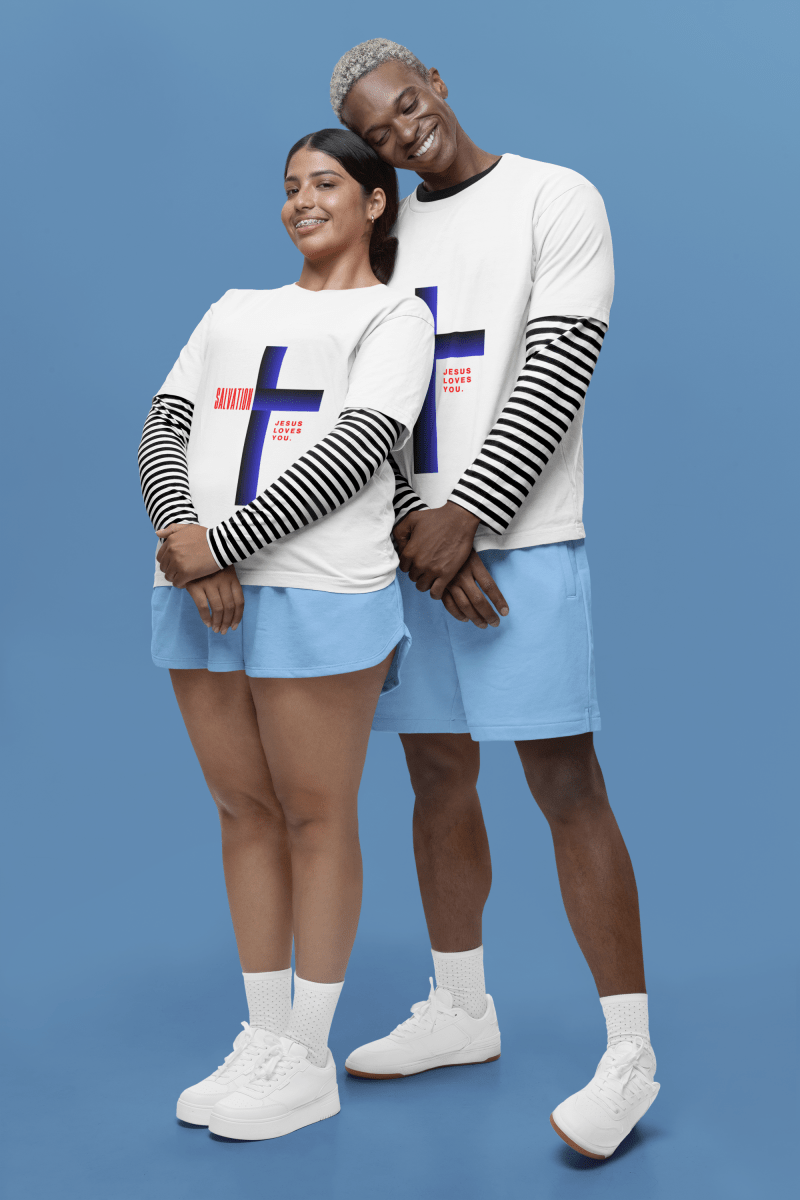 Share a powerful message of faith with the Smooth Visage unisex Salvation T-shirt. Designed with a bold white cross graphic and the words "SALVATION" in striking pink, along with the message "JESUS LOVES YOU" in white, this shirt makes a stylish statement of hope and love. Made from soft, breathable fabric, it offers all-day comfort and a relaxed fit, making it perfect for casual wear, church events, or everyday inspiration.