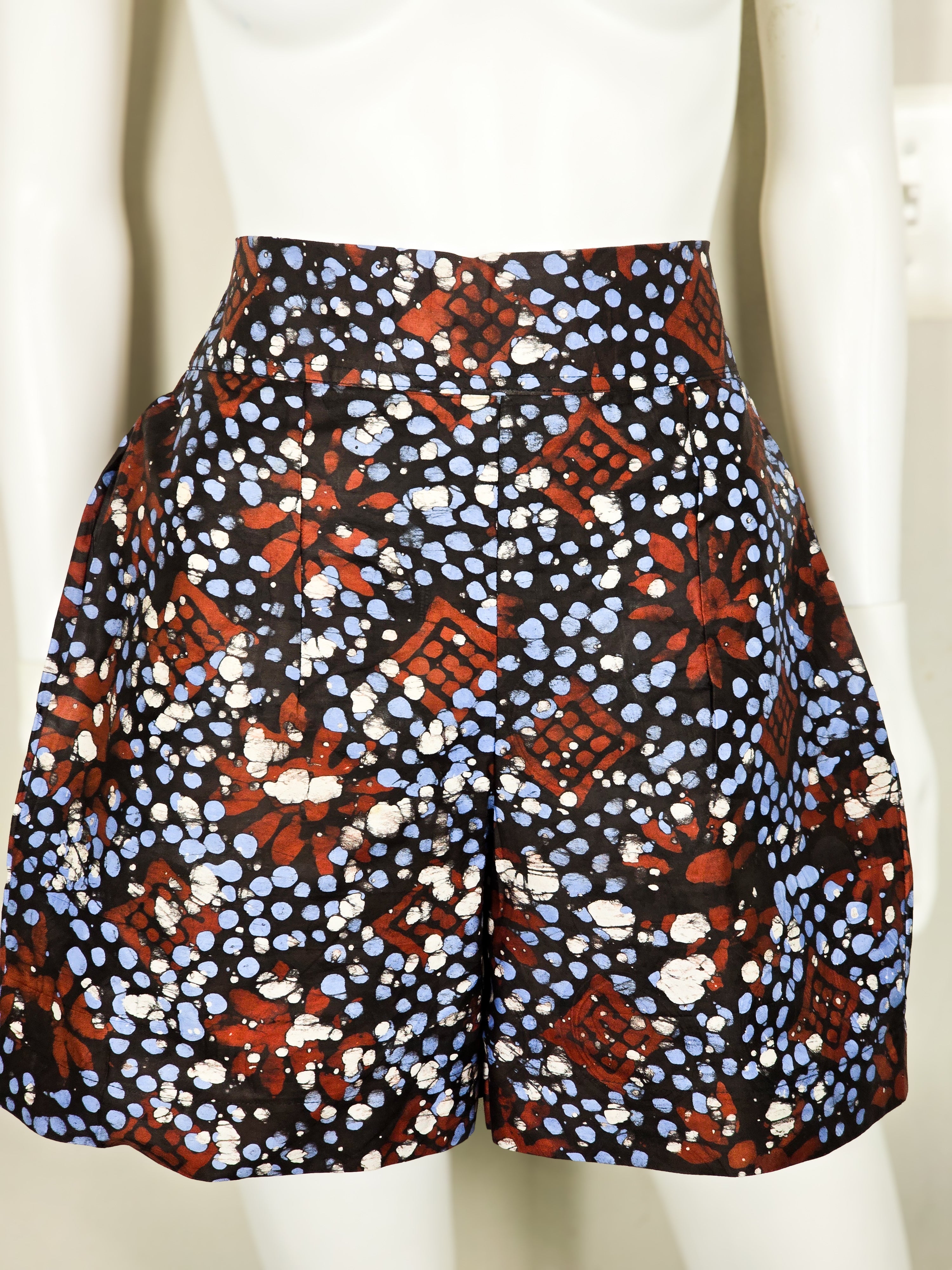 Crafted from premium Adire fabric, these handmade high-waist shorts combine bold African patterns with a flattering tailored fit. The design features pleated front detailing and a crisp waistband for structure. This is a one-of-a-kind piece perfect for sunny days or adding a cultural touch to your modern wardrobe. Please note: this item has been repaired after a small rip during its photoshoot. Now available at a discounted rate — still stylish, still wearable, still a statement.