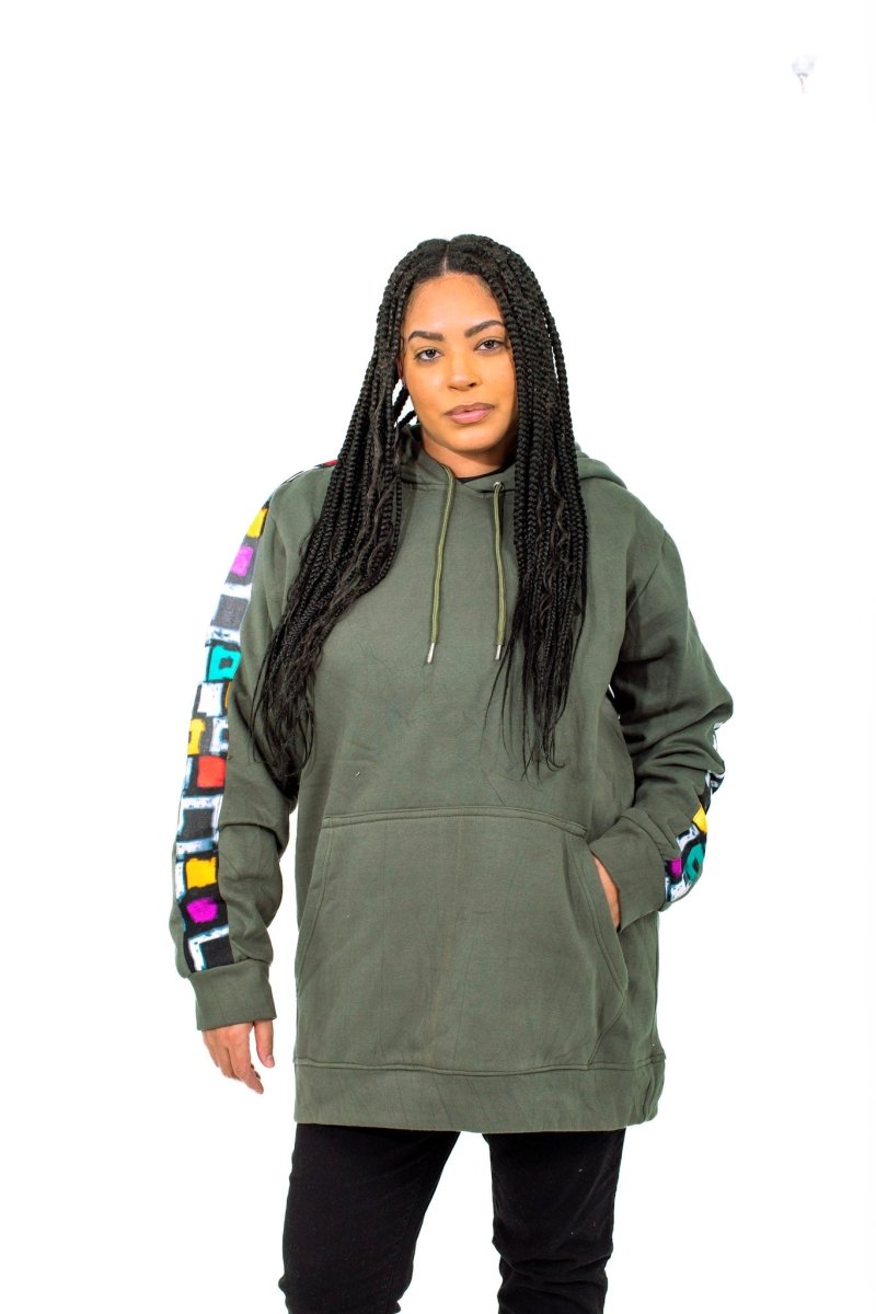 Olive Handmade Oversized Hoodie with Colorful Adire Sleeve Detail – Smooth Visage